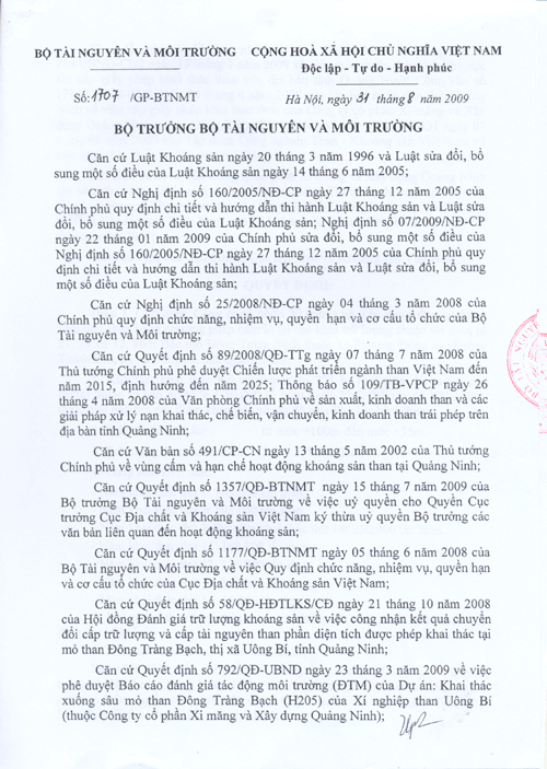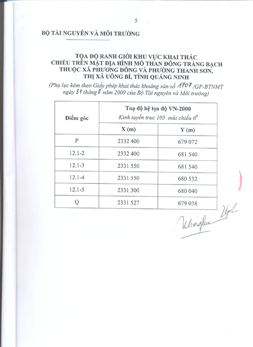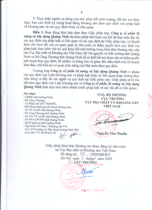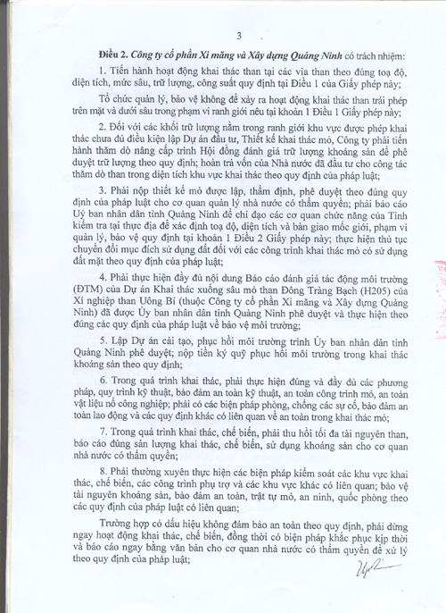 Ngày 11/9/2009 tại cục Địa chất và Khoáng sản Việt Nam – Bộ Tài nguyên và Môi trường đã tổ chức lễ trao giấy phép hoạt động khoáng sản số 1707GP/BTNMT Cho phép Công ty cổ phần Xi măng và Xây dựng Quảng Ninh khai thác than thuộc vỉa than số 27, 29 và 32, khối bắc mỏ Đông Tràng Bạch thuộc xã Phương Đông và Phường Thanh Sơn thị xã Uông bí tỉnh Quảng Ninh.