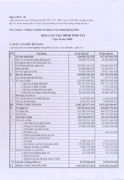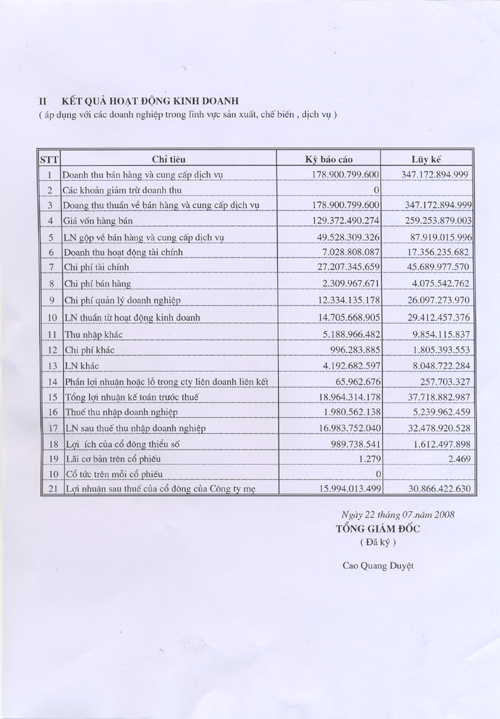 Báo cáo tóm tắt tài chính Quí II năm 2008