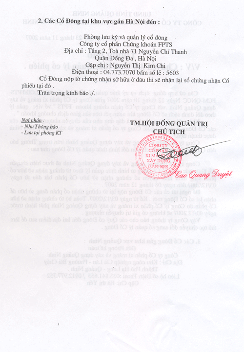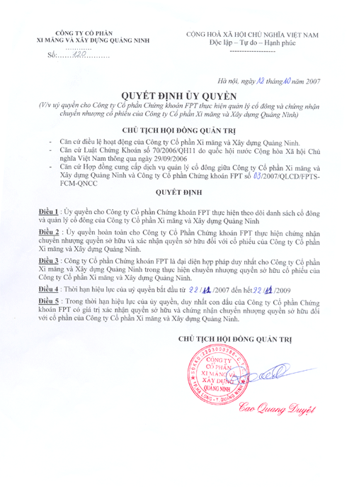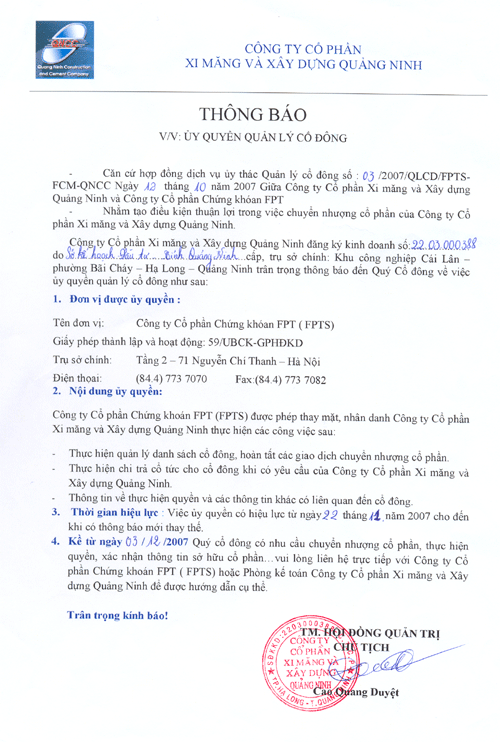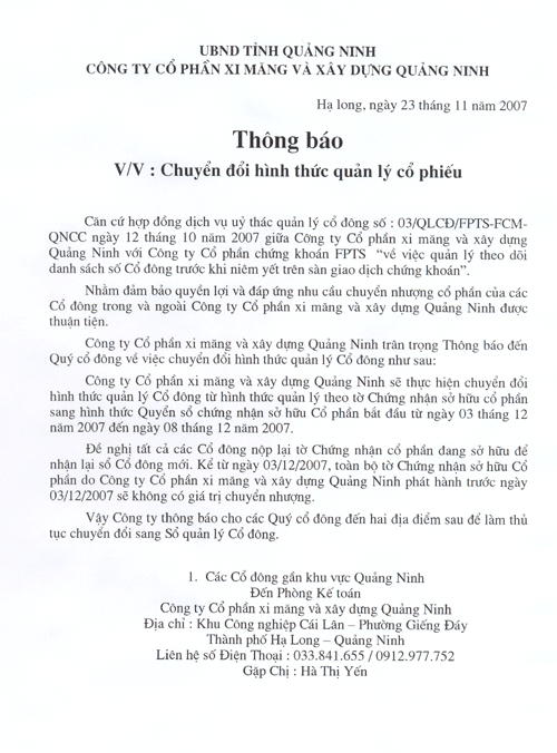 Thông báo:Chuyển đổi hình thức quản lý cổ phiếu và Uỷ quyền quản lý Cổ đông