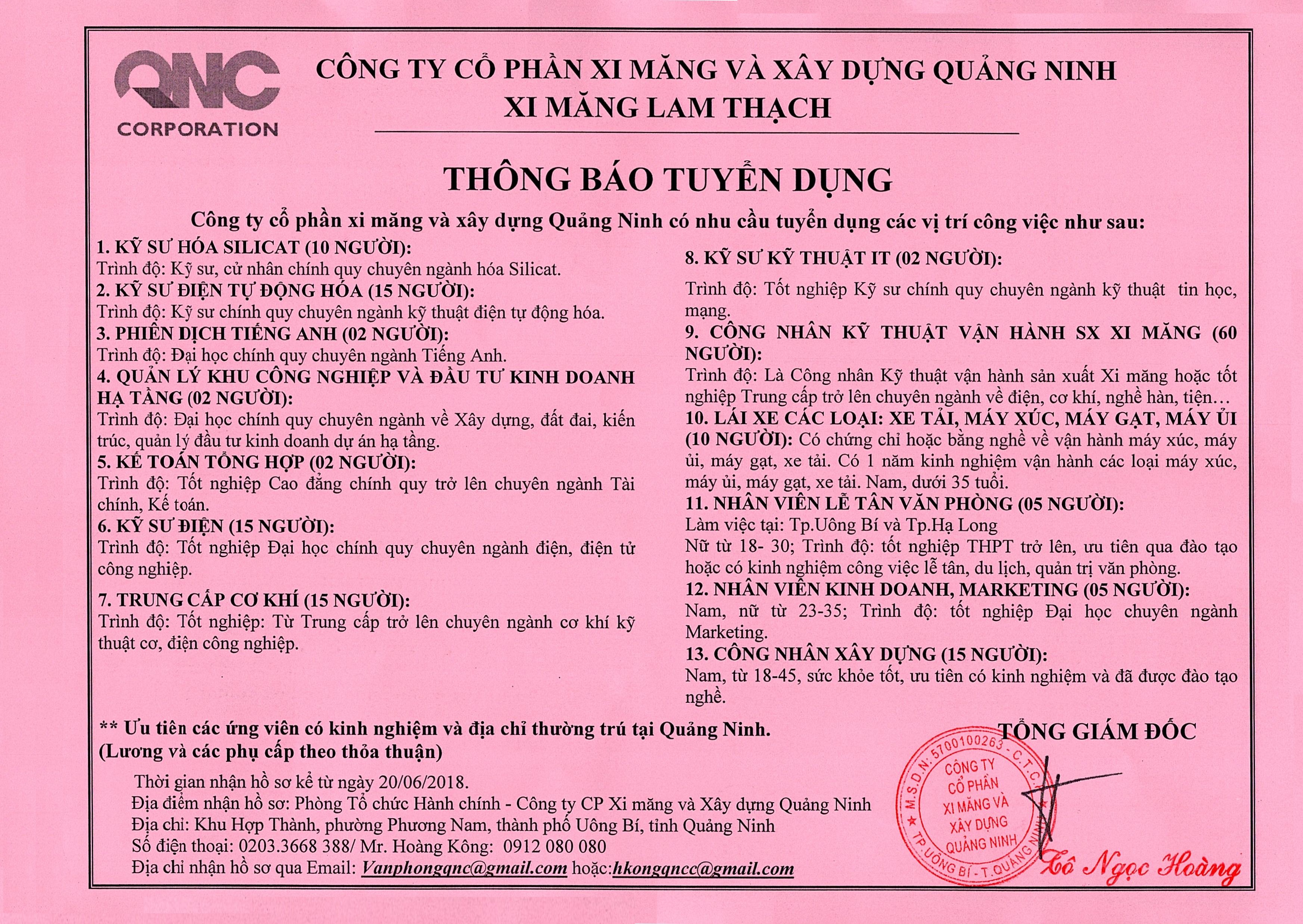 Công ty cổ phần xi măng và xây dựng Quảng Ninh xin thông báo tuyển dụng các vị trí công việc như sau: