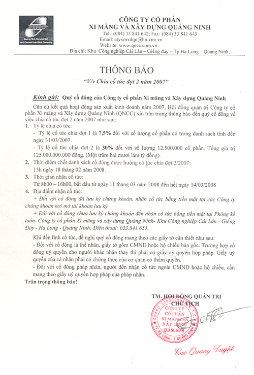 Thông báo V/v Chia cổ tức đợt 2 năm 2007