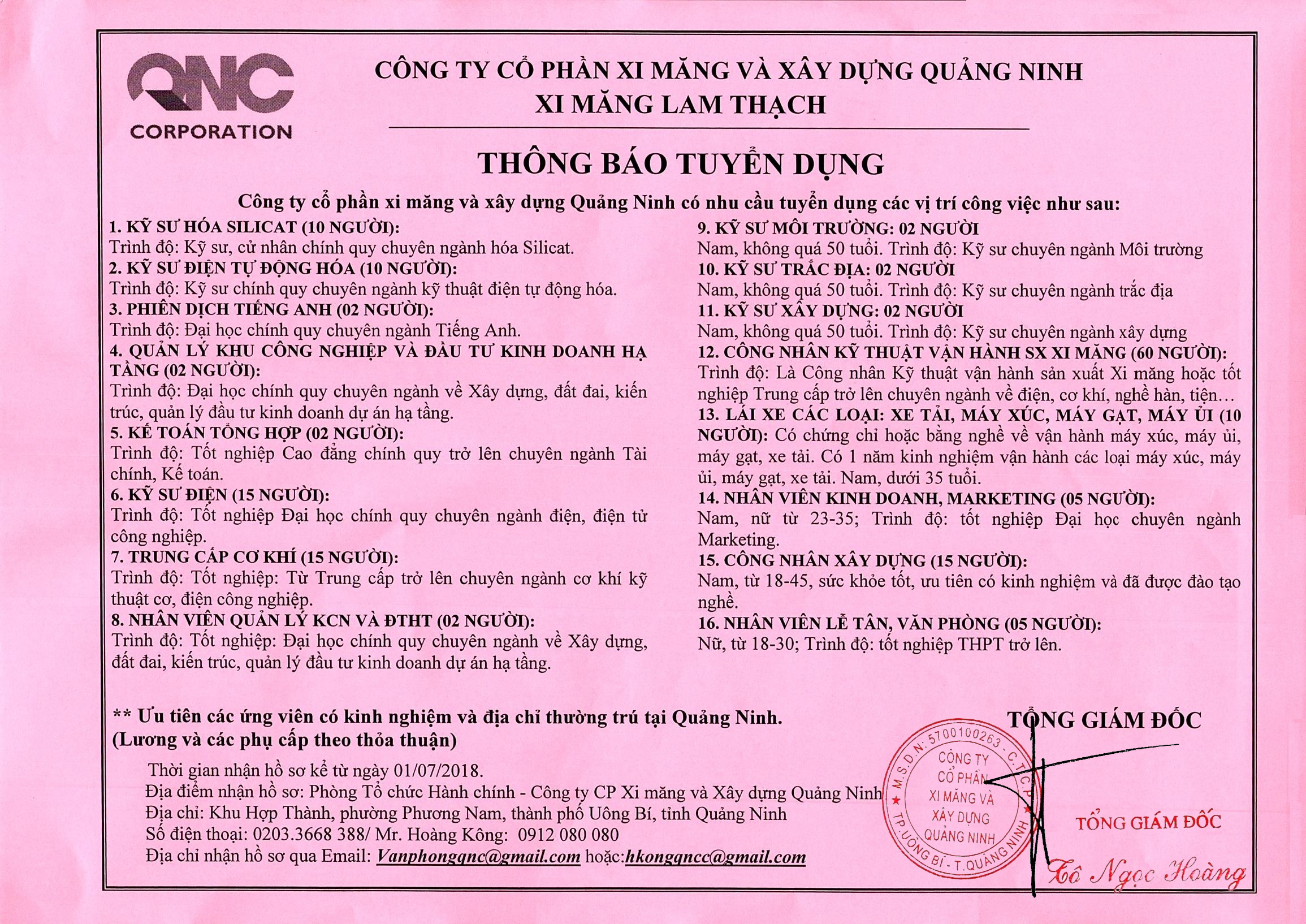 Công ty cổ phần xi măng và xây dựng Quảng Ninh xin thông báo tuyển dụng các vị trí công việc như sau: